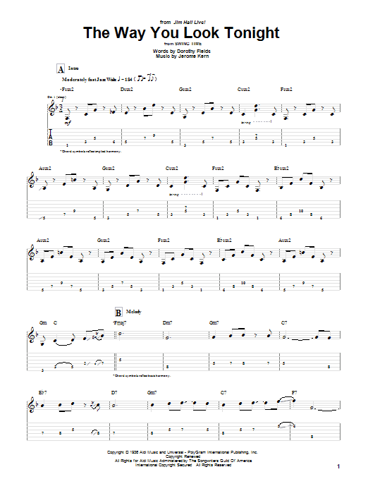 Download or print Jim Hall The Way You Look Tonight sheet music, chords and digital score arranged for Guitar Tab. This Film/TV score includes 8 page(s).
