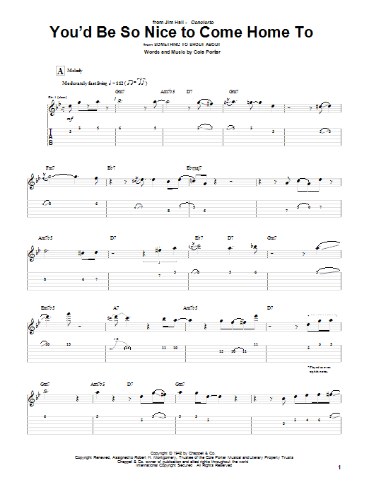 Download or print Jim Hall You'd Be So Nice To Come Home To sheet music, chords and digital score arranged for Guitar Tab. This Film/TV score includes 8 page(s).