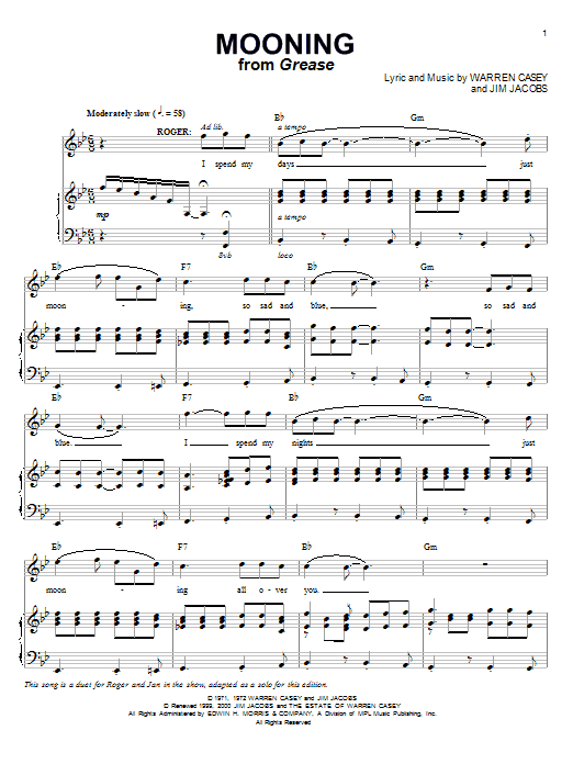 Download or print Jim Jacobs Mooning (from Grease) sheet music, chords and digital score arranged for Piano & Vocal. This Musical/Show score includes 5 page(s).
