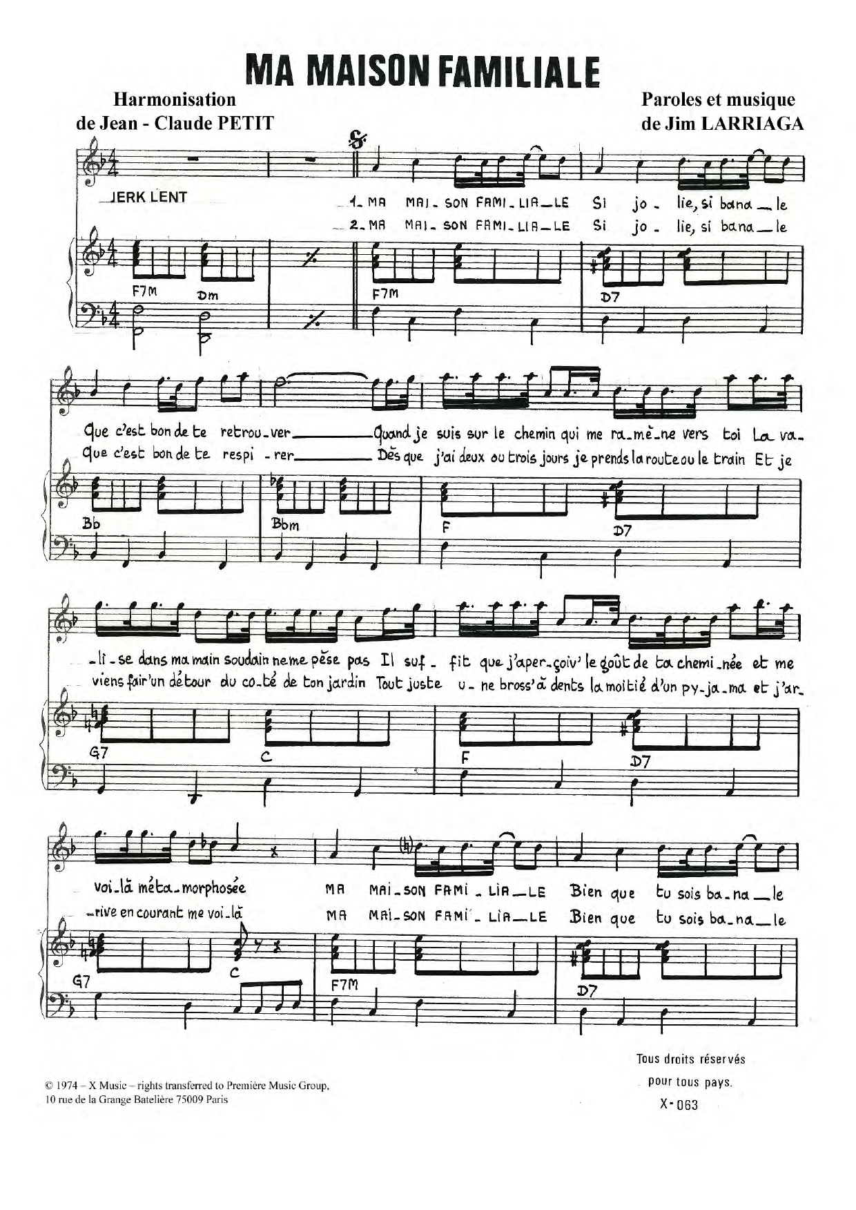 Download or print Jim Larriaga Ma Maison Familiale sheet music, chords and digital score arranged for Piano & Vocal. This Pop score includes 2 page(s).