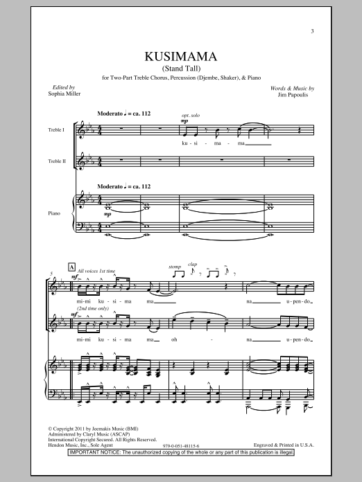 Download or print Jim Papoulis Kusimama (Stand Tall) sheet music, chords and digital score arranged for SSA Choir. This Concert score includes 13 page(s).