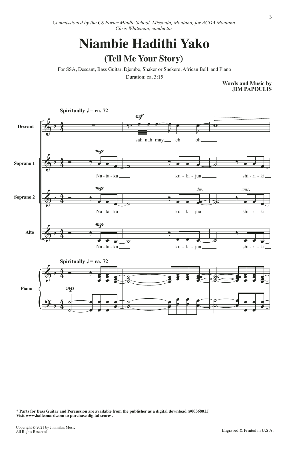 Download or print Jim Papoulis Niambie Hadithi Yako (Tell Me Your Story) sheet music, chords and digital score arranged for SSA Choir. This Concert score includes 19 page(s).