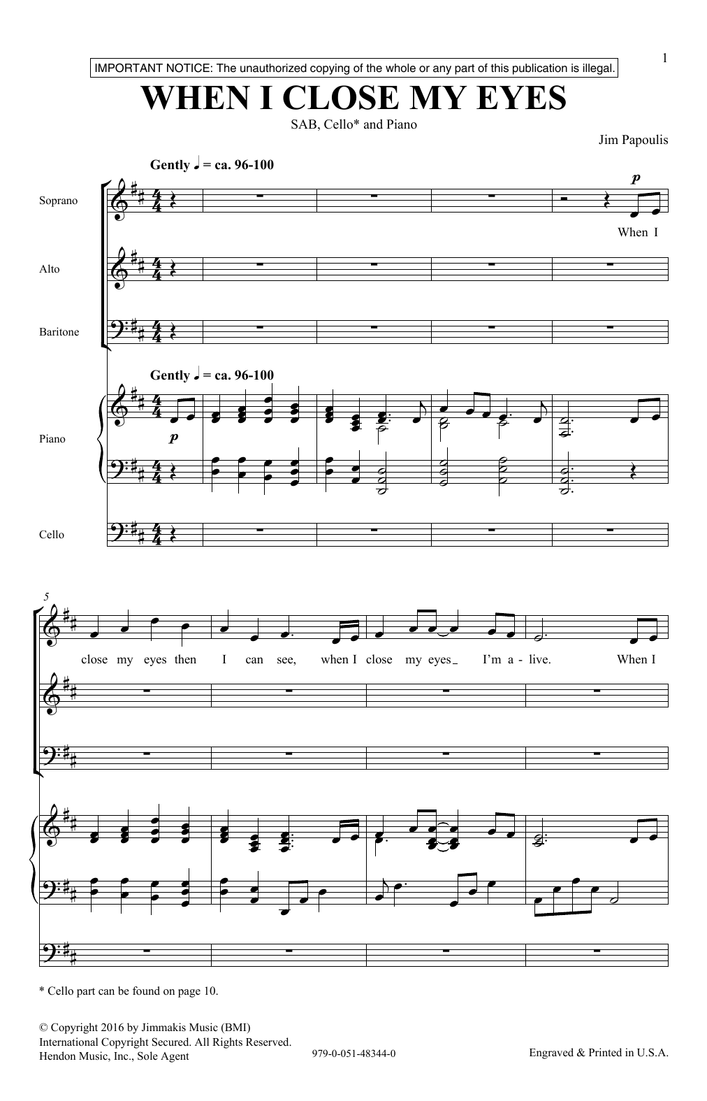 Download or print Jim Papoulis When I Close My Eyes sheet music, chords and digital score arranged for SAB Choir. This Festival score includes 10 page(s).