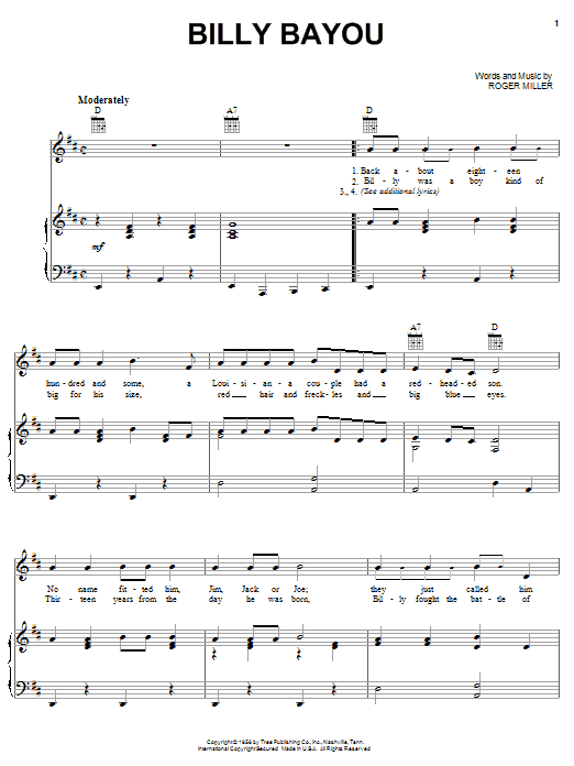 Download or print Jim Reeves Billy Bayou sheet music, chords and digital score arranged for Piano, Vocal & Guitar Chords. This Country score includes 2 page(s).