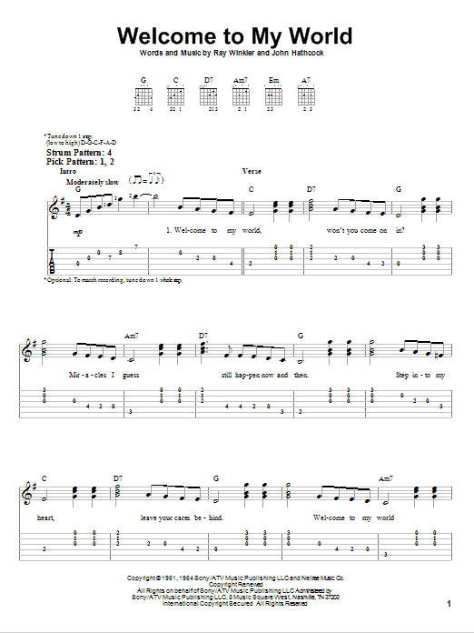 Download or print Jim Reeves Welcome To My World sheet music, chords and digital score arranged for Easy Guitar Tab. This Country score includes 2 page(s).
