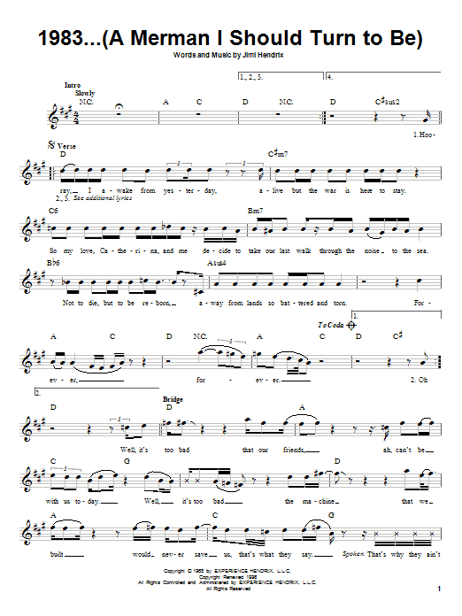 Download or print Jimi Hendrix 1983...(A Merman I Should Turn To Be) sheet music, chords and digital score arranged for Guitar Tab. This Rock score includes 8 page(s).