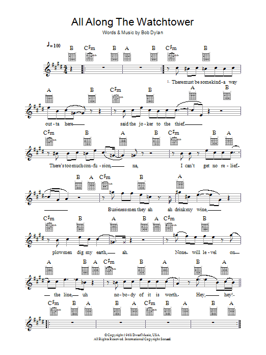Download or print Jimi Hendrix All Along The Watchtower sheet music, chords and digital score arranged for Piano, Vocal & Guitar Chords (Right-Hand Melody). This Pop score includes 6 page(s).