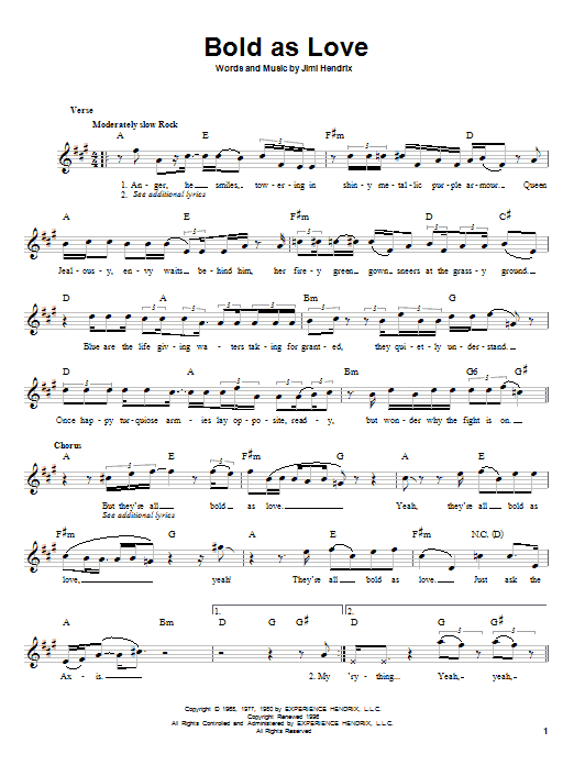 Download or print Jimi Hendrix Bold As Love sheet music, chords and digital score arranged for Easy Guitar. This Blues score includes 2 page(s).