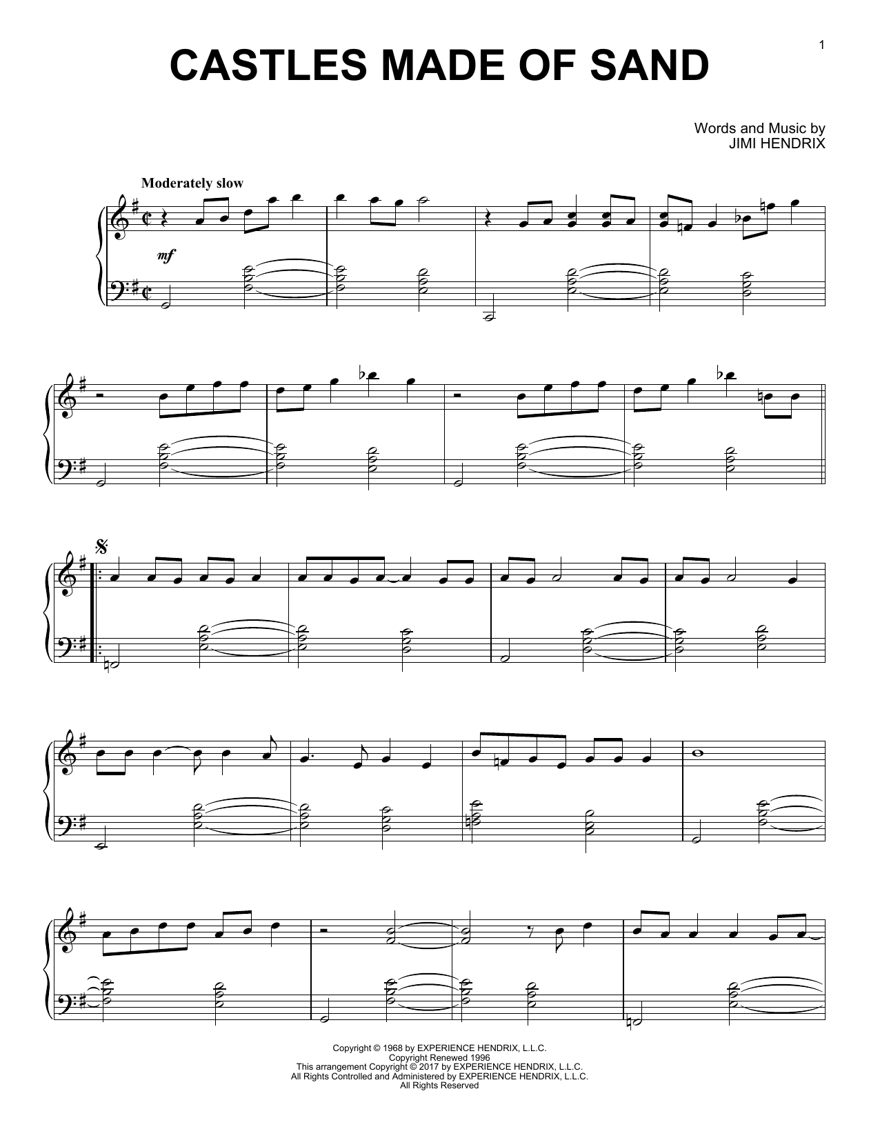 Download or print Jimi Hendrix Castles Made Of Sand [Jazz version] sheet music, chords and digital score arranged for Piano Solo. This Pop score includes 3 page(s).