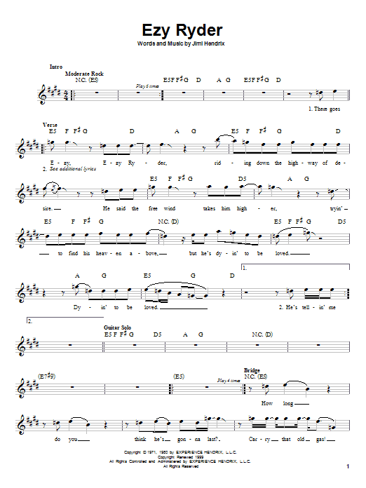 Download or print Jimi Hendrix Ezy Ryder sheet music, chords and digital score arranged for Piano, Vocal & Guitar Chords (Right-Hand Melody). This Pop score includes 6 page(s).