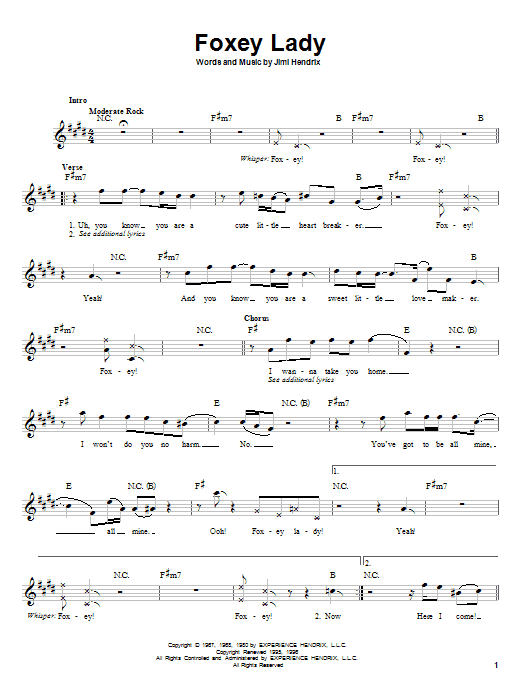 Download or print Jimi Hendrix Foxey Lady sheet music, chords and digital score arranged for Guitar Tab. This Pop score includes 12 page(s).