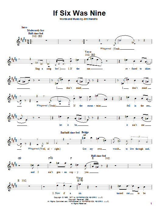 Download or print Jimi Hendrix If Six Was Nine sheet music, chords and digital score arranged for Piano, Vocal & Guitar Chords (Right-Hand Melody). This Pop score includes 4 page(s).