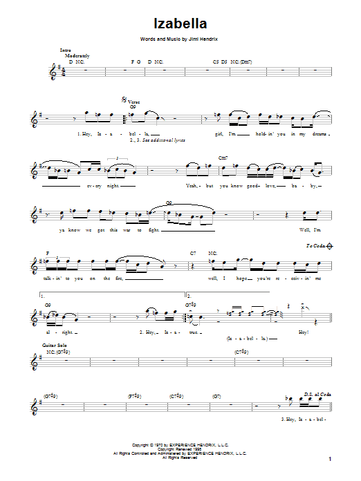 Download or print Jimi Hendrix Izabella sheet music, chords and digital score arranged for Guitar Tab. This Pop score includes 19 page(s).