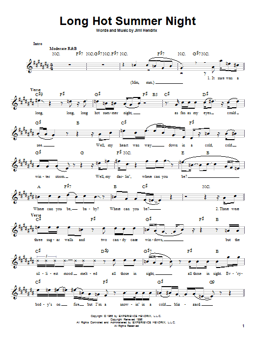 Download or print Jimi Hendrix Long Hot Summer Night sheet music, chords and digital score arranged for Piano, Vocal & Guitar Chords (Right-Hand Melody). This Rock score includes 7 page(s).