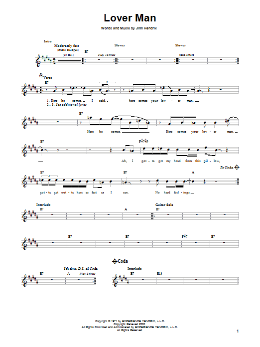 Download or print Jimi Hendrix Lover Man sheet music, chords and digital score arranged for Guitar Tab. This Pop score includes 9 page(s).