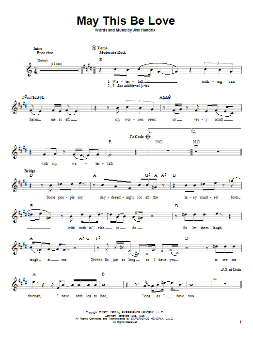 Download or print Jimi Hendrix May This Be Love sheet music, chords and digital score arranged for Piano, Vocal & Guitar Chords (Right-Hand Melody). This Rock score includes 5 page(s).