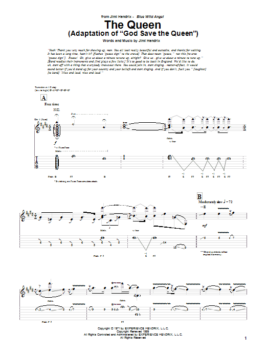 Download or print Jimi Hendrix The Queen (Adaptation of "God Save The Queen") sheet music, chords and digital score arranged for Guitar Tab. This Pop score includes 2 page(s).