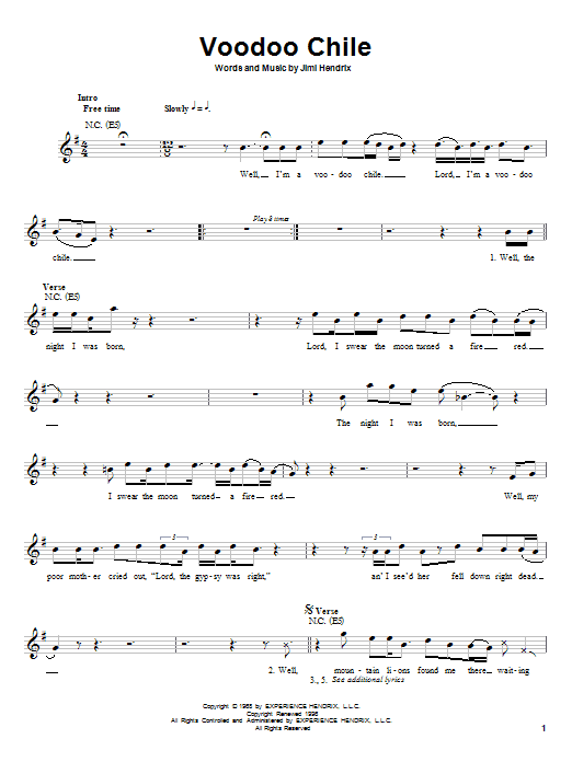 Download or print Jimi Hendrix Voodoo Chile sheet music, chords and digital score arranged for Easy Guitar. This Blues score includes 4 page(s).