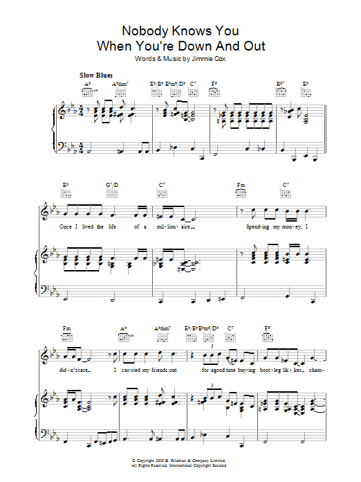 Download or print Jimmie Cox Nobody Knows You When You're Down And Out sheet music, chords and digital score arranged for Piano, Vocal & Guitar Chords. This Pop score includes 4 page(s).
