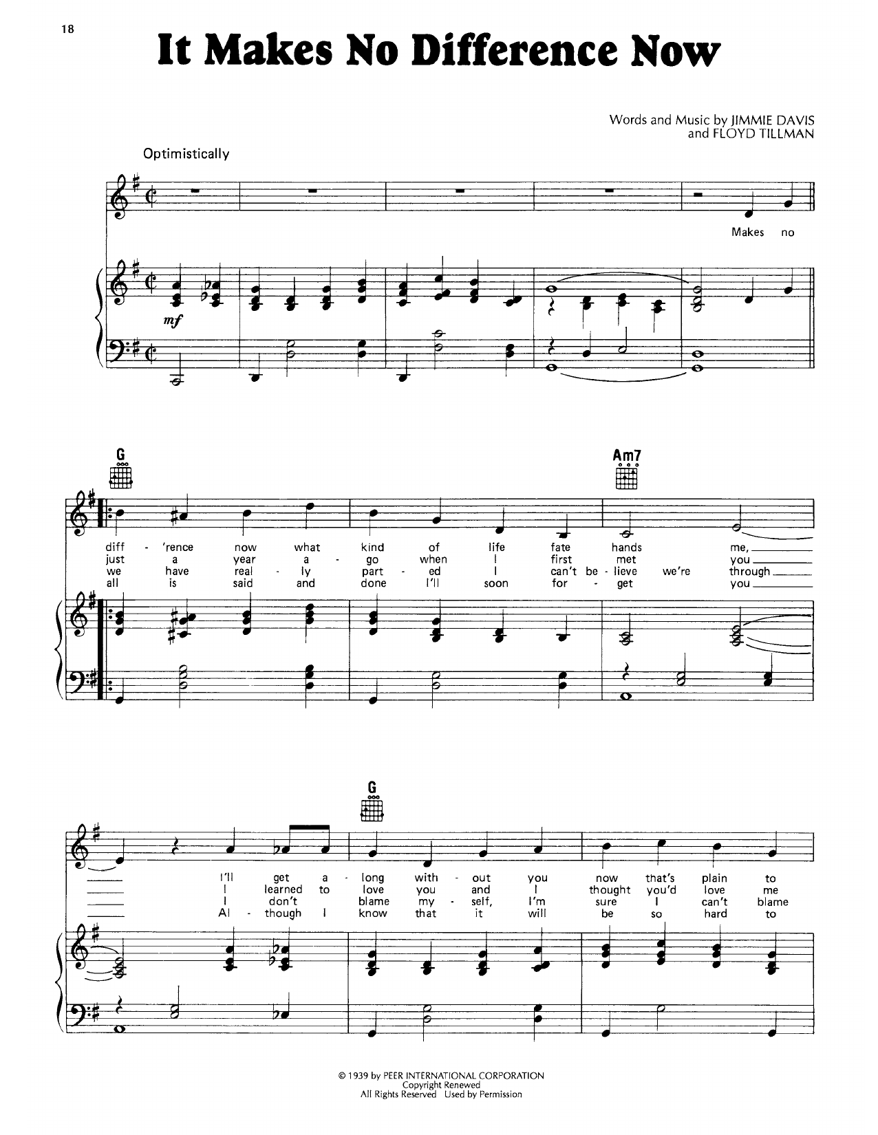Download or print Jimmie Davis It Makes No Difference Now (from Louisiana) sheet music, chords and digital score arranged for Piano, Vocal & Guitar Chords (Right-Hand Melody). This Country score includes 2 page(s).