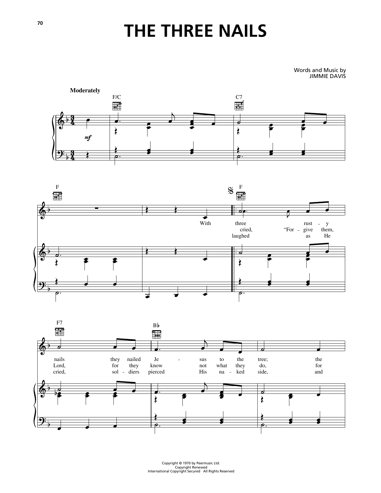 Download or print Jimmie Davis The Three Nails sheet music, chords and digital score arranged for Piano, Vocal & Guitar Chords (Right-Hand Melody). This Country score includes 3 page(s).