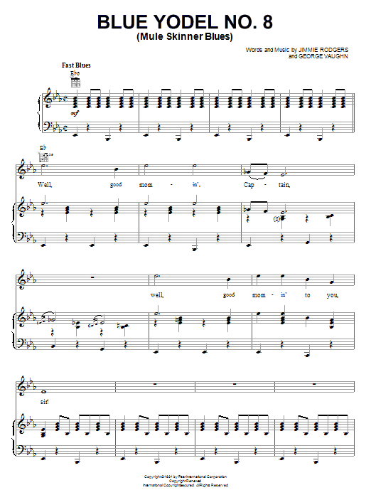Download or print Jimmie Rodgers Blue Yodel No. 8 (Mule Skinner Blues) sheet music, chords and digital score arranged for Piano, Vocal & Guitar Chords (Right-Hand Melody). This Country score includes 7 page(s).