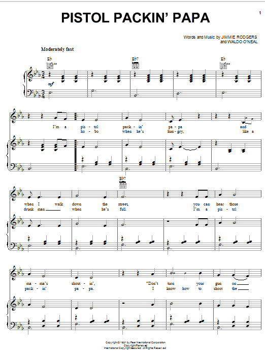 Download or print Jimmie Rodgers Pistol Packin' Papa sheet music, chords and digital score arranged for Piano, Vocal & Guitar Chords (Right-Hand Melody). This Country score includes 6 page(s).
