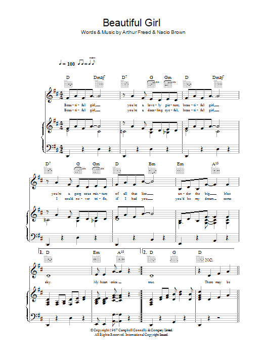 Download or print Jimmie Thompson Beautiful Girl (from Singin' In The Rain) sheet music, chords and digital score arranged for Piano, Vocal & Guitar Chords. This Musical/Show score includes 6 page(s).
