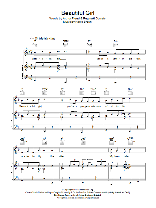 Download or print Nacio Herb Brown Beautiful Girl (from Singin' In The Rain) sheet music, chords and digital score arranged for Piano, Vocal & Guitar Chords. This Musical/Show score includes 4 page(s).