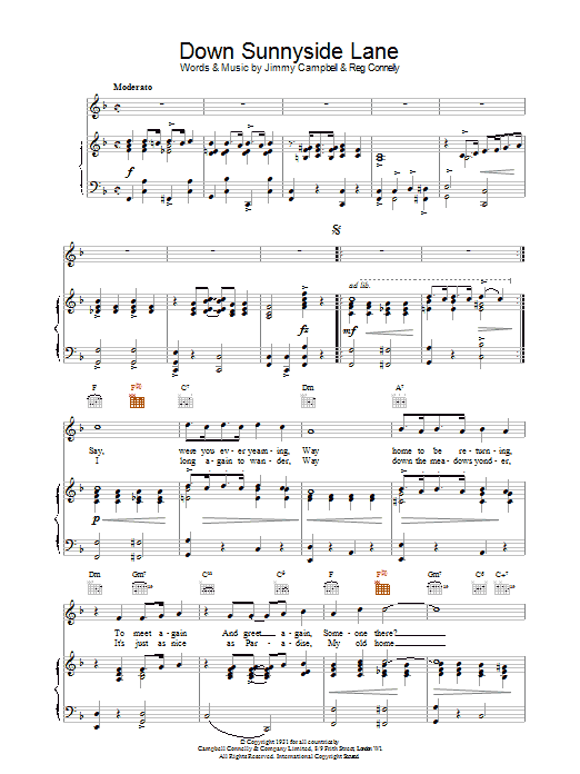Download or print Jimmy Campbell Down Sunnyside Lane sheet music, chords and digital score arranged for Lead Sheet / Fake Book. This Jazz score includes 2 page(s).