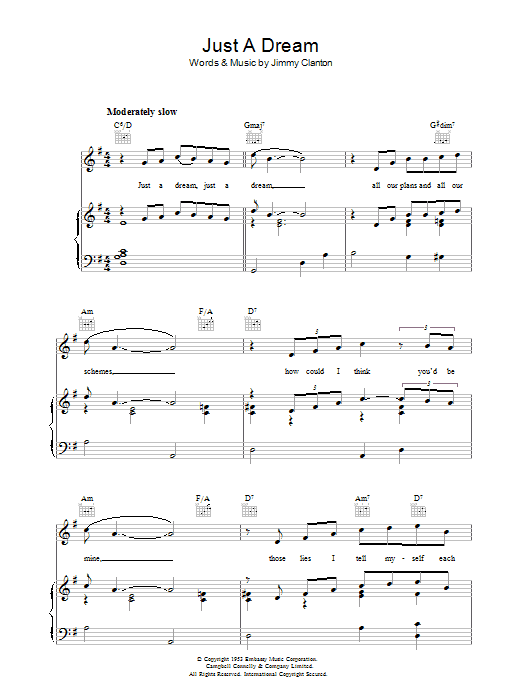 Download or print Jimmy Clanton Just A Dream sheet music, chords and digital score arranged for Piano, Vocal & Guitar Chords. This Pop score includes 4 page(s).