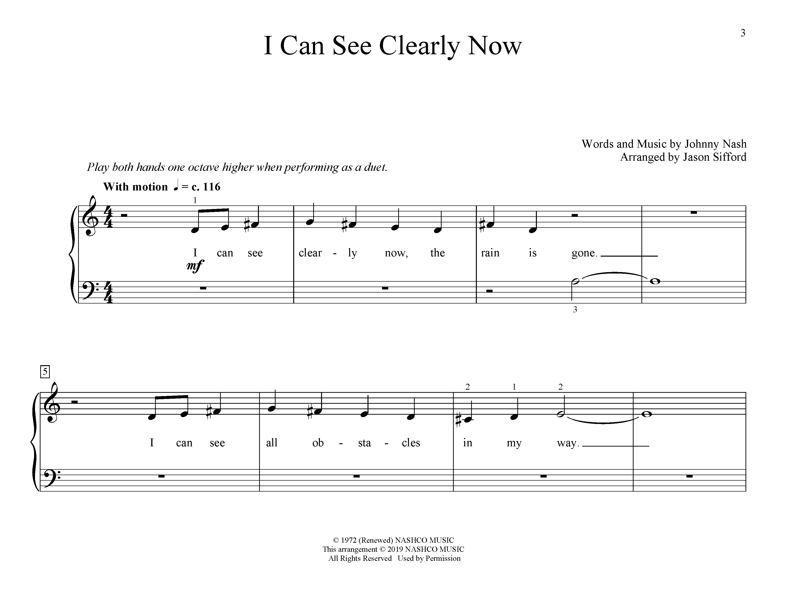 Download or print Jimmy Cliff I Can See Clearly Now (arr. Jason Sifford) sheet music, chords and digital score arranged for Educational Piano. This Pop score includes 4 page(s).