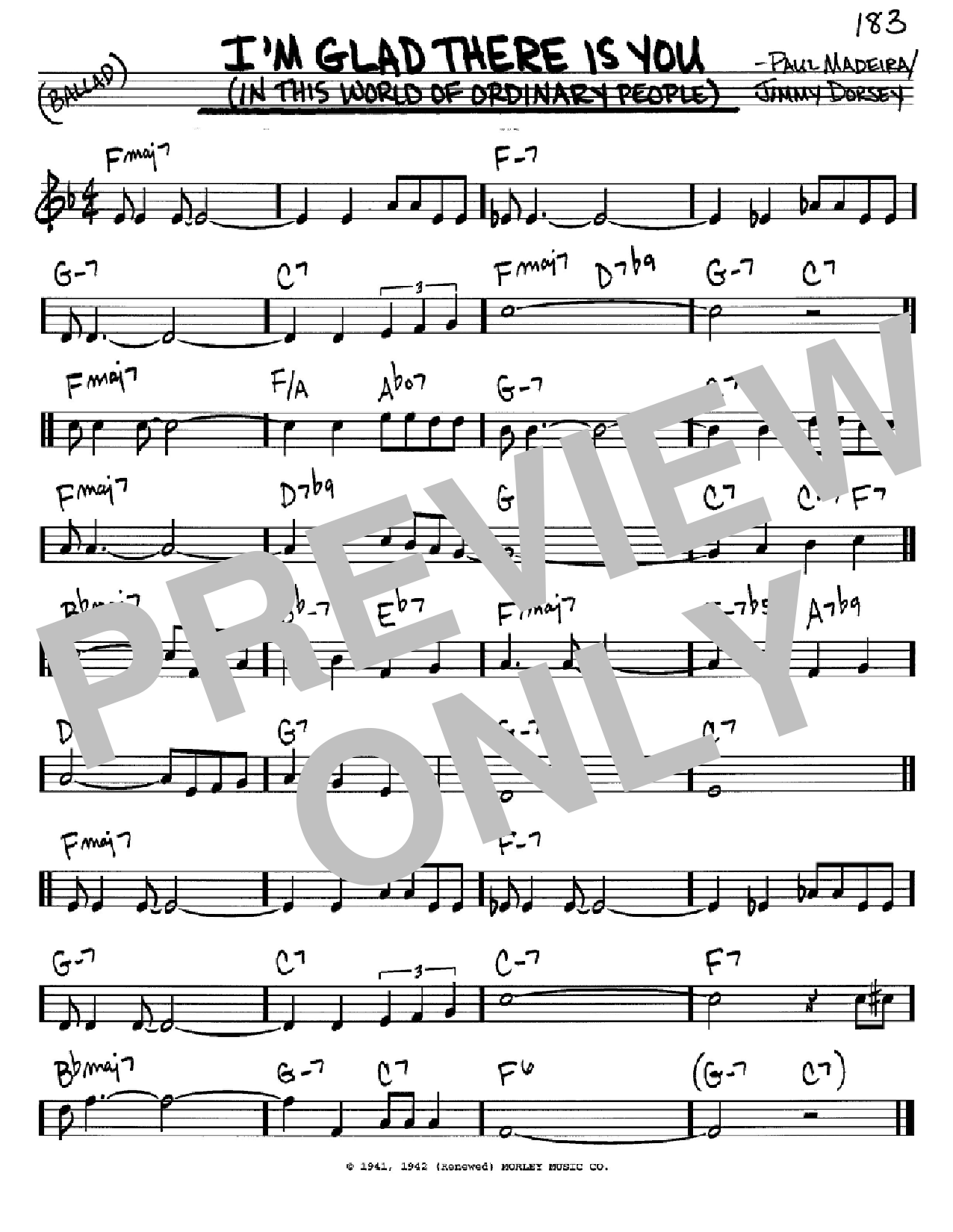 Download or print Jimmy Dorsey I'm Glad There Is You (In This World Of Ordinary People) sheet music, chords and digital score arranged for Real Book – Melody & Chords – C Instruments. This Jazz score includes 1 page(s).