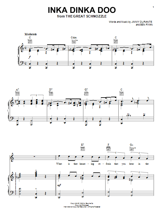 Download or print Jimmy Durante Inka Dinka Doo sheet music, chords and digital score arranged for Piano, Vocal & Guitar Chords (Right-Hand Melody). This Novelty score includes 5 page(s).