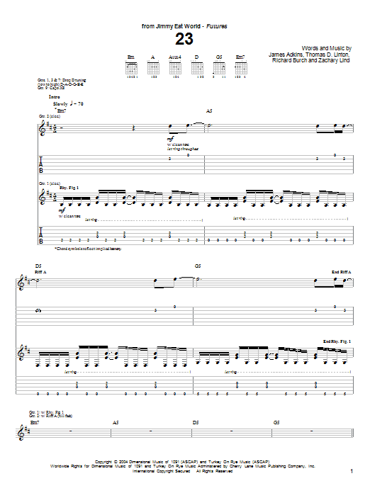 Download or print Jimmy Eat World 23 sheet music, chords and digital score arranged for Guitar Tab. This Pop score includes 9 page(s).