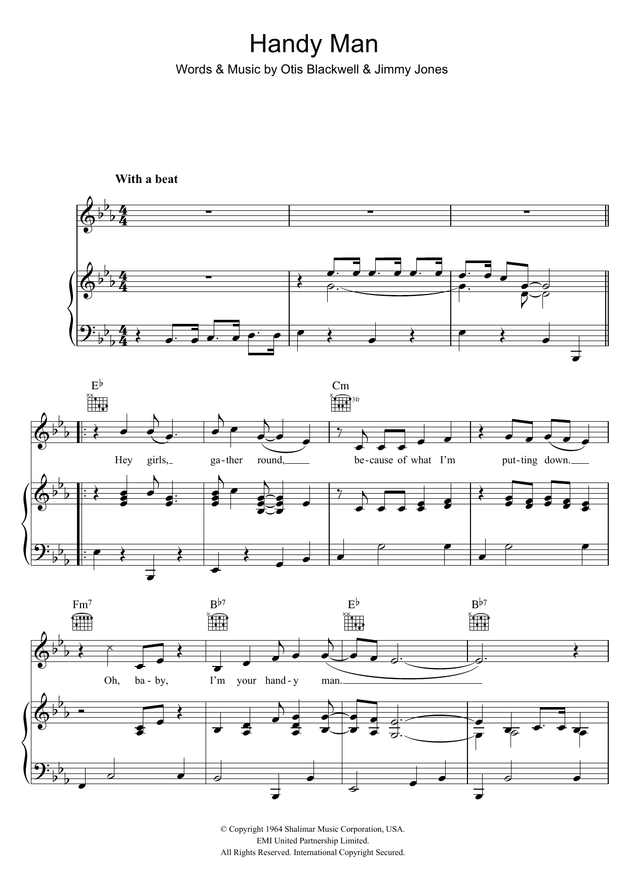 Download or print Jimmy Jones Handy Man sheet music, chords and digital score arranged for Piano, Vocal & Guitar Chords. This Pop score includes 3 page(s).