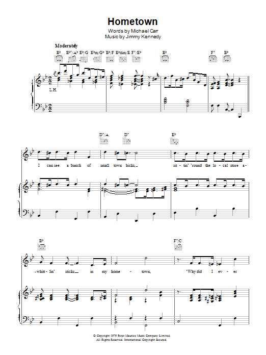 Download or print Jimmy Kennedy Hometown sheet music, chords and digital score arranged for Piano, Vocal & Guitar Chords. This Standards score includes 5 page(s).