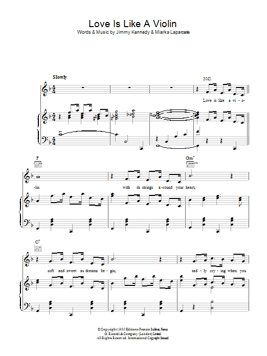 Download or print Jimmy Kennedy Love Is Like A Violin (Mon Coeur Est Un Violon) sheet music, chords and digital score arranged for Piano, Vocal & Guitar Chords. This Standards score includes 4 page(s).