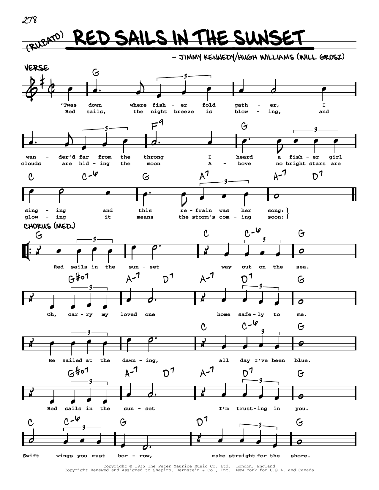 Download or print Jimmy Kennedy Red Sails In The Sunset (arr. Robert Rawlins) sheet music, chords and digital score arranged for Real Book – Melody, Lyrics & Chords. This Jazz score includes 2 page(s).