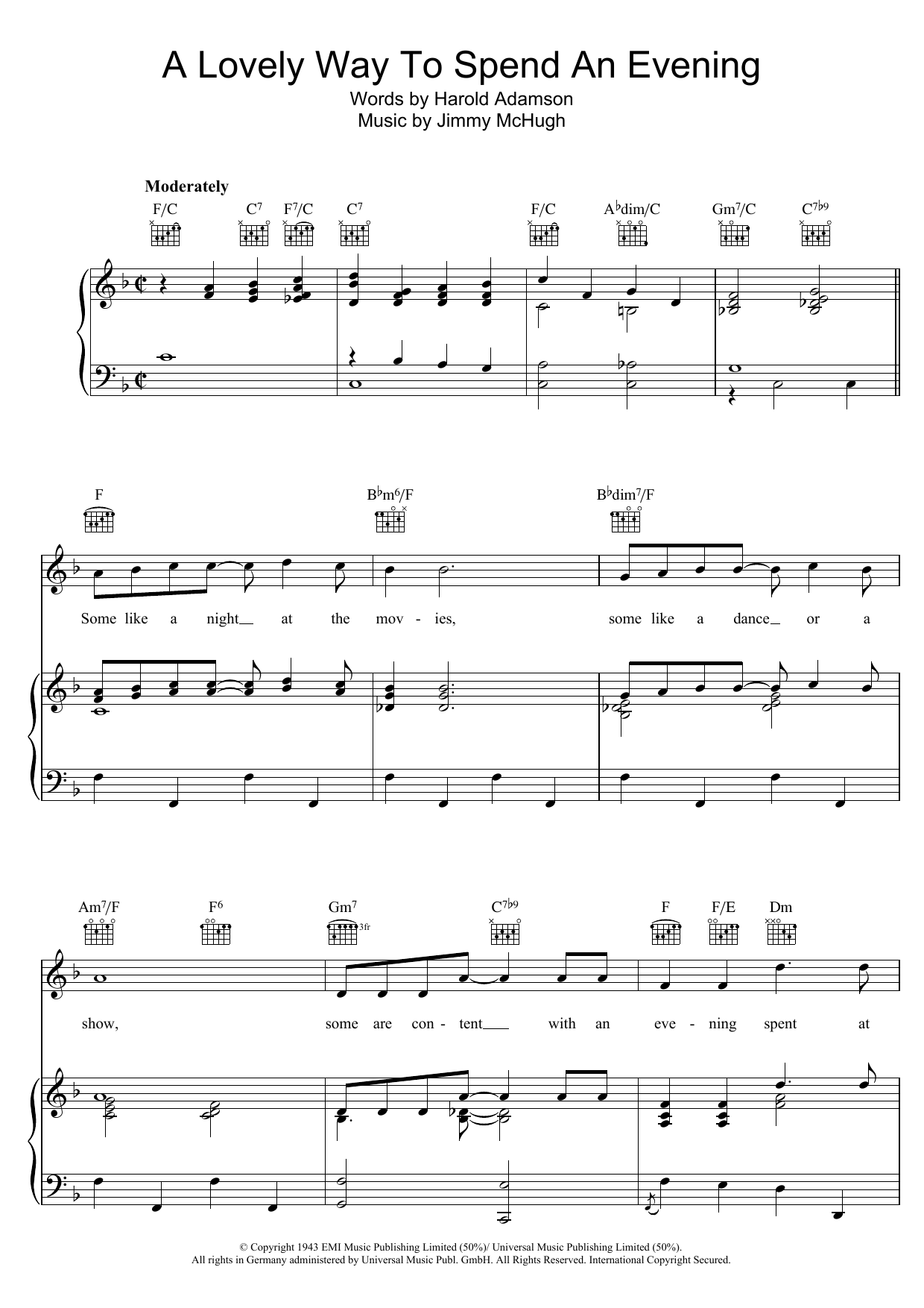 Download or print Jimmy McHugh A Lovely Way To Spend An Evening sheet music, chords and digital score arranged for Piano, Vocal & Guitar Chords. This Standards score includes 6 page(s).