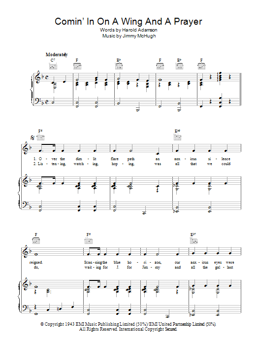 Download or print Jimmy McHugh Comin' In On A Wing And A Prayer sheet music, chords and digital score arranged for Piano, Vocal & Guitar Chords. This Standards score includes 5 page(s).