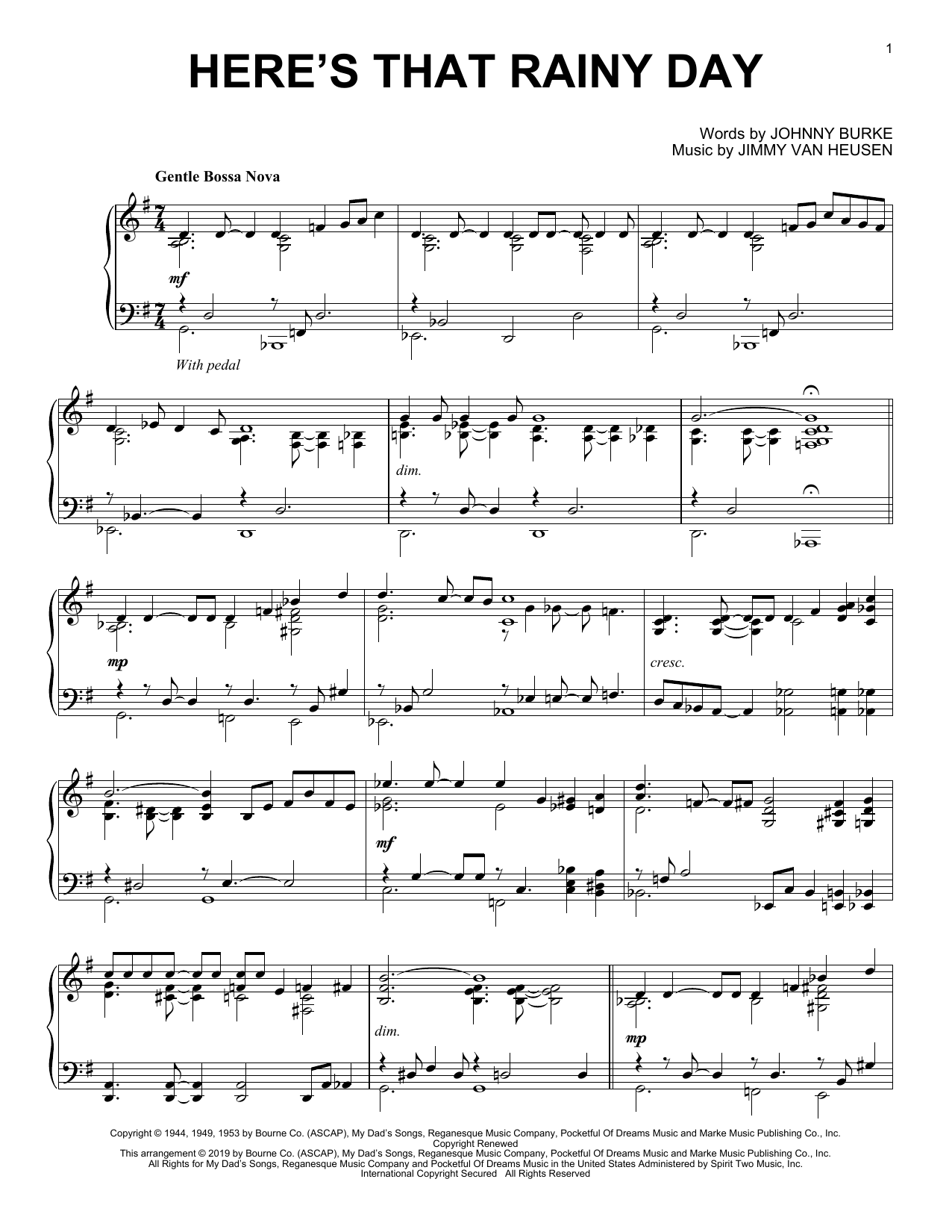 Download or print Jimmy Van Heusen Here's That Rainy Day (arr. Brent Edstrom) sheet music, chords and digital score arranged for Piano Solo. This Jazz score includes 3 page(s).