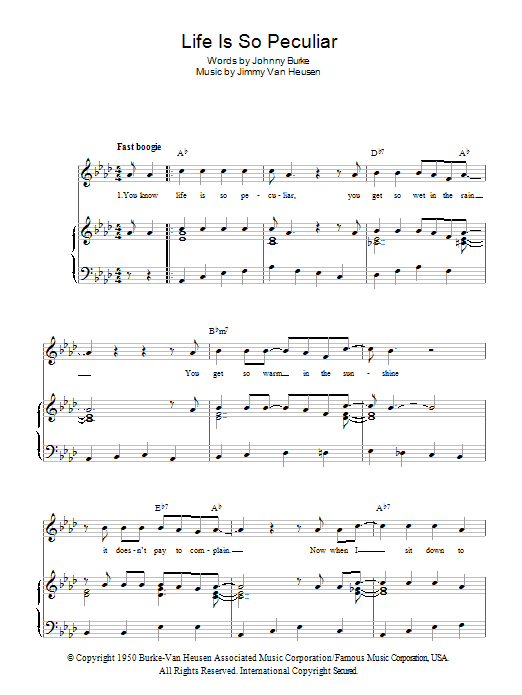 Download or print Jimmy Van Heusen Life Is So Peculiar sheet music, chords and digital score arranged for Piano, Vocal & Guitar Chords. This Jazz score includes 3 page(s).