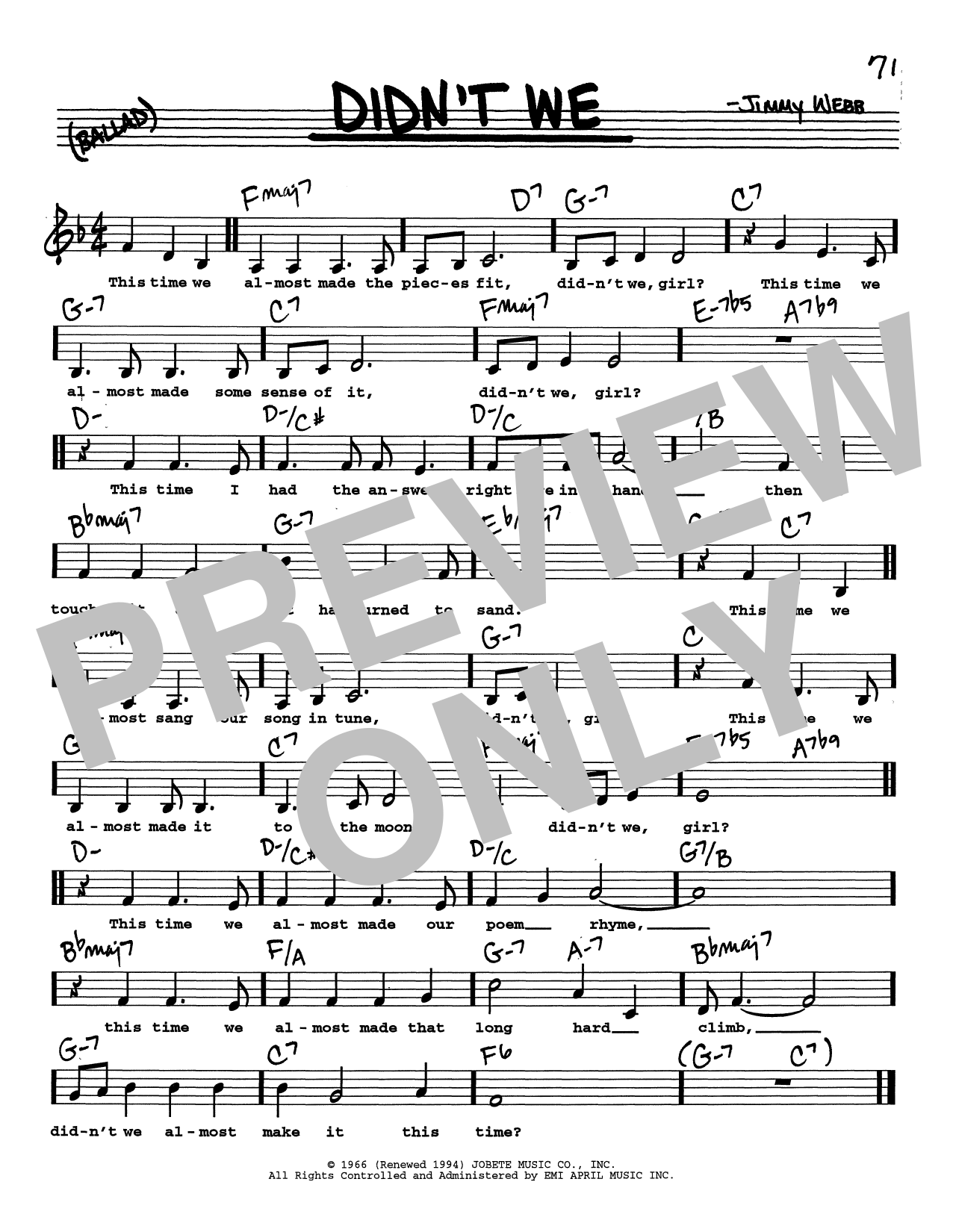 Download or print Jimmy Webb Didn't We (Low Voice) sheet music, chords and digital score arranged for Real Book – Melody, Lyrics & Chords. This Jazz score includes 1 page(s).