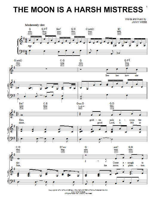 Download or print Jimmy Webb The Moon Is A Harsh Mistress sheet music, chords and digital score arranged for Piano, Vocal & Guitar Chords (Right-Hand Melody). This Pop score includes 4 page(s).
