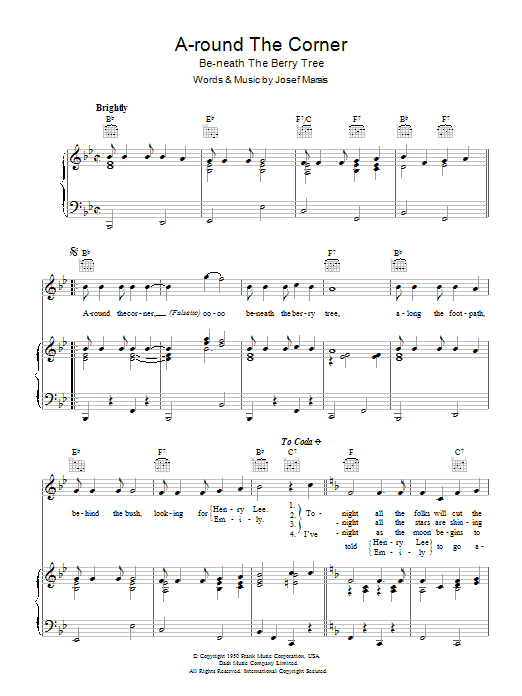 Download or print Jo Stafford A-round The Corner (Be-neath The Berry Tree) sheet music, chords and digital score arranged for Piano, Vocal & Guitar Chords. This Standards score includes 2 page(s).