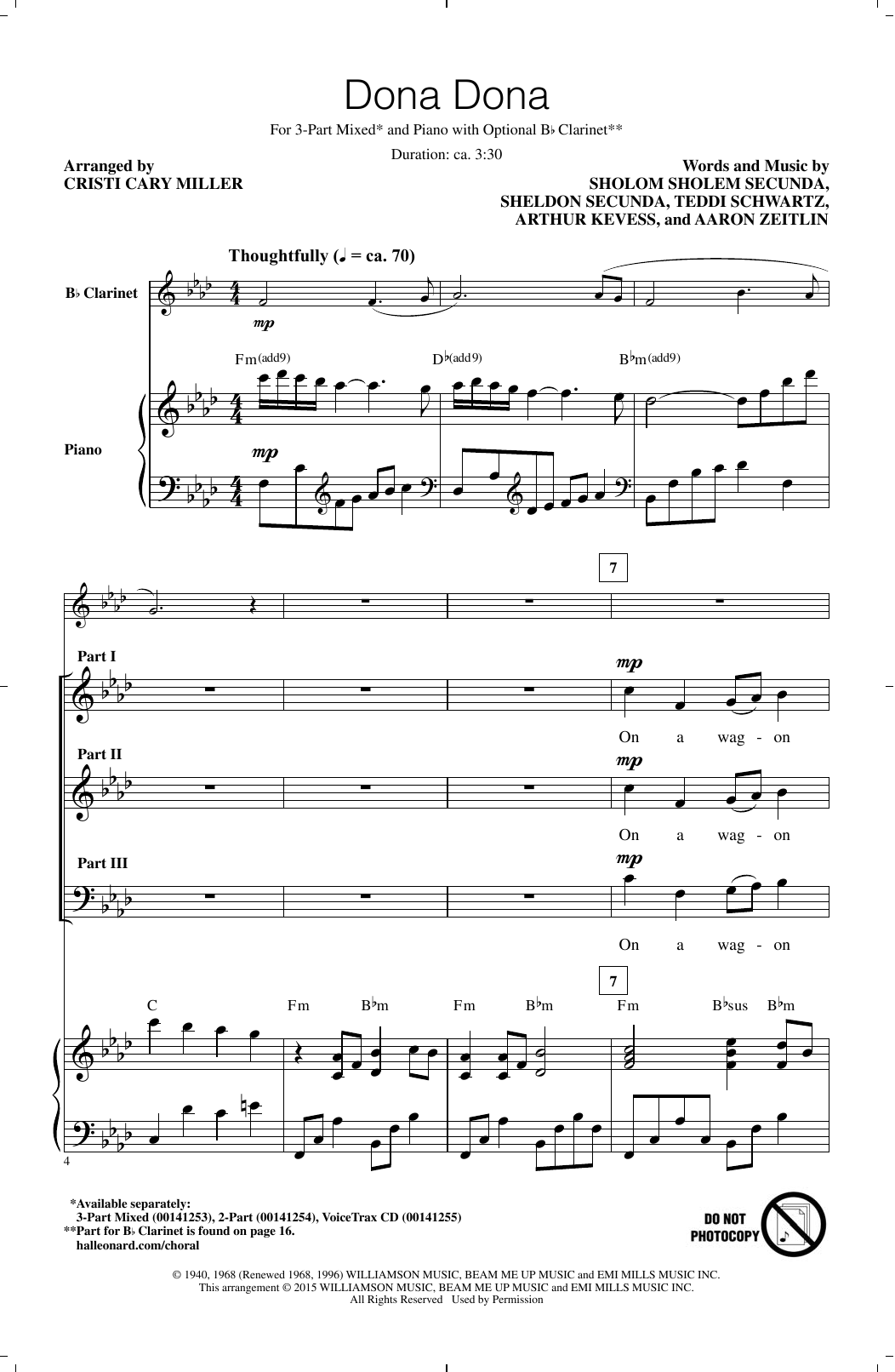 Download or print Teddi Schwartz Dona Dona (arr. Cristi Cary Miller) sheet music, chords and digital score arranged for 3-Part Mixed Choir. This Folk score includes 14 page(s).