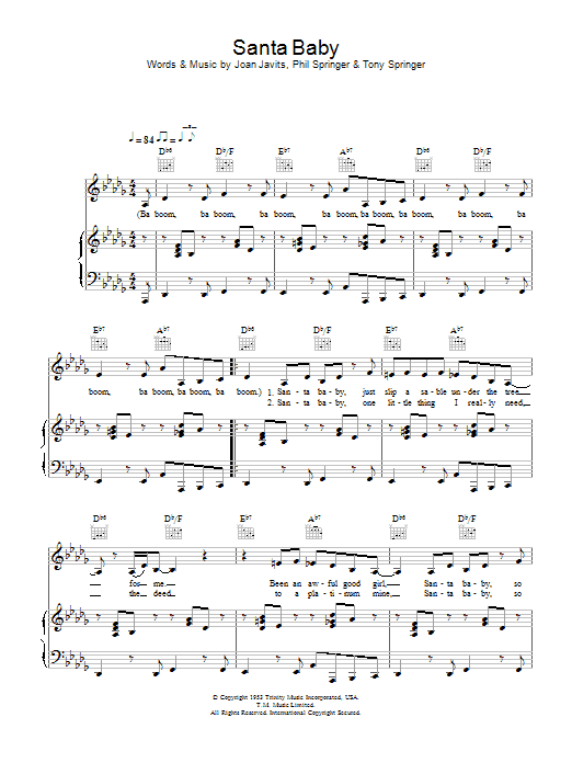 Download or print Eartha Kitt Santa Baby sheet music, chords and digital score arranged for Very Easy Piano. This Christmas score includes 3 page(s).