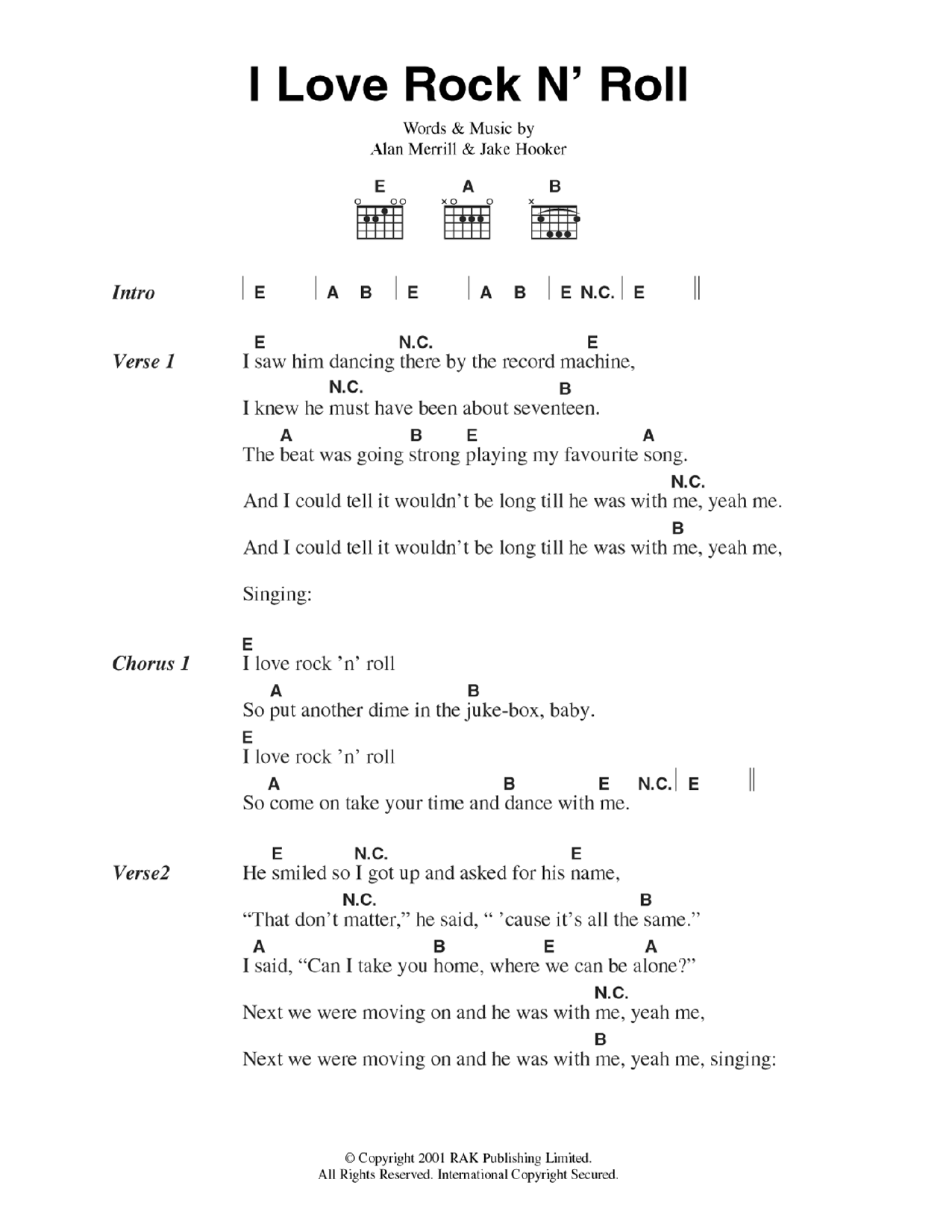 Download or print Joan Jett I Love Rock N' Roll sheet music, chords and digital score arranged for Guitar Chords/Lyrics. This Rock score includes 2 page(s).