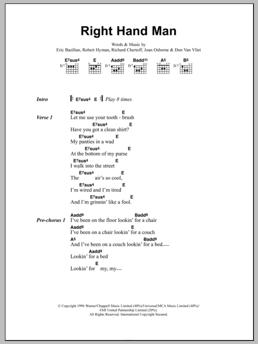 Download or print Joan Osbourne Right Hand Man sheet music, chords and digital score arranged for Guitar Chords/Lyrics. This Pop score includes 4 page(s).